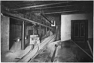 Coal was carried in side-dump cars, from which it was dumped into a hopper below each customer's boiler room. A conveyor then carried the coal up from the trackside hopper to the customer's boiler room.[79] The details of the latter connection depended on the depth of the building's basement. Chicago's new City building on the corner of Washington and LaSalle had a subbasement 38 feet (11.58 m) below sidewalk level, so the tunnel connection was made by a 10-foot-deep (3.05 m) trench.[81] The Commercial National Bank's coal bins were under the sidewalk on Clark Street. There, coal was lifted from the tunnel by a vertical bucket conveyor running in a small shaft.[82]