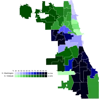 Washington won a plurality of the vote in 27 of Chicago's 50 wards (winning a majority in 25 of those wards).[38] Vrdolyak won a plurality in 23 wards (winning a majority in 20 of those wards).[38]