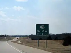 Bonds for the first section were approved in 1989.[2] The bonds specifically permitted the turnpike to be transferred to the Oklahoma Department of Transportation and become a free road, the only turnpike in Oklahoma eligible for this type of transfer.[7] At the time, however, ODOT director Bobby Green said that his agency could not buy the turnpike due to a lack of funds.[9] The Chickasaw cost nearly $44 million to build (equivalent to $71.3 million in 2023[10]).[4] Its first section opened on September 1, 1991.[2] Originally, the turnpike began at SH-7 west of Sulphur, proceeding northeast to the US-177 junction, then continuing northeast on its present-day alignment.[3]
