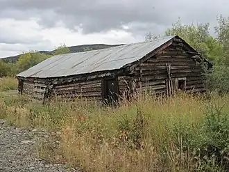 The population peaked at around 400 in 1903, dwindling to about 7–12 year-round residents today, though summertime sees visitor numbers and seasonal residents rise to 20–100.[2][3] Active small-scale mining continues, anchored by the historic Pedro Dredge. Seasonal tourism—gold-panning, tours, mining lore—supplements the income of the locals.[2][5] The town has a café, saloon, campgrounds, and the annual Chickenstock music festival in June draw additional tourists.[2] There are about 15 wood-frame and log buildings erected between 1908 and 1967 during the town’s gold-mining peak. It includes bunkhouses, roadhouses, and sections of the historic pipeline that carried water from Mosquito Creek for mining operations. The "Pedro Dredge", originally built in 1938, transferred to Chicken in 1959, and used until 1967, was moved to its current site in 1998.[6][7]