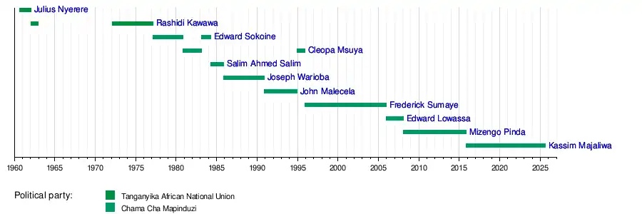 This is a list of the prime ministers of Tanzania, from the establishment of the office of Chief Minister of Tanganyika in 1960 to the present day.