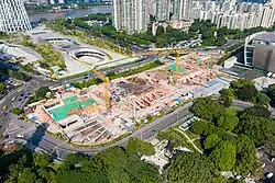 In response to the construction of the station, the construction party began to enclose part of the green space of Canton Tower South Square in Chigang Pagoda Park from November 2019 to cooperate with the preliminary work of the station construction,[1] then enclosed the section from the north side of the intersection of Youlin East Street on Yizhou Road to the north side of Chigang North Road from midnight on 30 May 2020.[10] In April 2024, the station roof slab was sealed.[11] The station completed the "three rights" transfer on 30 April 2025.[12]