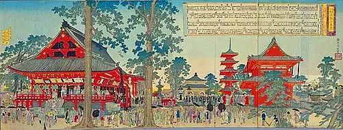 - ^ one of which is a five panel print from the series, "The Imperial Ladies' Quarters at Chiyoda Palace" entitled, konrei (こんれい) The Marriage Ceremony and there is a four panel tetraptych displaying Golden Dragon Mountain in Asakusa Park. The other is a very well known nine-panel print entitled Meiji Sanjū-Ichi-Nen Shi-Gatsu Tōka: Tento Sanjū-Nen Shukugakai Yokyō Gyōretsu no Zu (明治31年4月10日: 奠都30年祝賀會餘興行列の図), The Procession in Commemoration of the Thirtieth Anniversary of the Transfer of the Capital.
