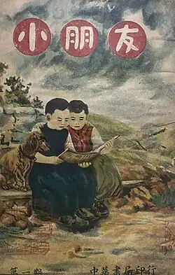 Magazines for children emerged in the early 1900s, including Educational Pictures for Children (1908–1925) and Fairy Tales (1909–1932).[12] Children's World (published by the Commercial Press) and Little Friend (published by the Zhonghua Book Company) became the most prominent of these children's journals, each seeing biweekly circulations of over 20,000 copies.[24] The Chinese publishing industry became highly dependent on the lucrative children's literature market. Publishers such as the Beixin Book Company, Kaiming Shudian, and Xiandai Shuju all published large volumes of children's books. Beixin and Xiandai launched their own children's magazines — Little Student and Modern Child respectively — in an attempt to compete with periodicals such as Children's World.[25] Shanghai, the center of the Chinese literary community during the Republican era, also became the center of children's literature and publishing.[26]