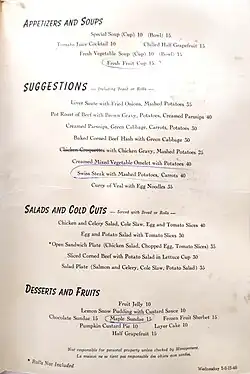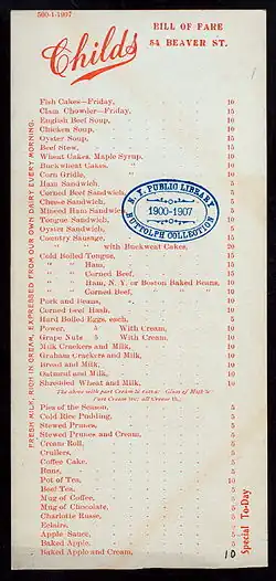 - ^ "1907 Childs Menu". Menu with locations on reverse. New York Public Library. p. 2. Retrieved May 25, 2014.