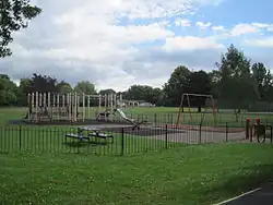 It is a mainly grassed area with two tennis courts, a bowls club, a children's playground, a cafe and toilets. Clitterhouse Brook, a tributary of the River Brent, runs along the southern edge in a concrete pipe which is visible in places.[2]