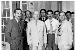 The promulgation, in 1948, of the Law 8.987 "Defense of Democracy Law" that banned the communists, was again a factor of division among the socialists.[13] Bernardo Ibáñez, Oscar Schnake, Juan Bautista Rosseti and other anticommunist socialists supported it with enthusiasm; while the board of directors of the party directed by Raúl Ampuero and Eugenio González rejected it. The anticommunist group of Ibáñez was expelled from the PS and they constituted the Socialist Party of the Workers; nevertheless the Conservative of the electoral Roll assigned to the group of Ibáñez the name Socialist Party of Chile, forcing the group of Ampuero to adopt the name Socialist Popular Party.[14]