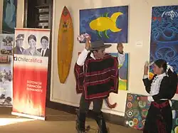 The Mapuche people were the main indigenous people populating the region running from Copiapó in the north to Chiloé in the south. The Mapuche were never conquered by the Incas, so their music and musical instruments differ from the northern cultures that fell under Andean influence. Spanish chroniclers observed their musical rituals with interest, and their observations have allowed historians to compare this early music with the Mapuche music of the modern day. Historian Samuel Marti writes that the Mapuche “do not dance or sing to demonstrate knowledge and skill, or to entertain spectators, but to honour their gods”.[4][5] Mapuche music today, despite the influence of Christianity, is still an expression of faith, hopes or fears to the traditional gods, because the conquest did not change the spirit of these peoples, even though it introduced new cultural elements.[6] The Franciscan missionary Geronimo de Ore (Lima, Peru, circa 1598) noted that Mapuche children learned songs from a very young age and demonstrated excellent memory and sense of rhythm. De Ore, realizing that these skills could be used as an evangelization and religious indoctrination tool, proposed that Christian prayers should have been taught in the native language and sung to native or European tunes. The same method was used in Chile by Jesuit priests. Jesuit priest Bernardo Havestadt came to Chile in 1748 and worked as missionary in La Mocha Concepción, Rere and Santa Fe. In 1777, he published a document in Westphalia that contains 19 Mapuche songs accompanied by European-style music. Unlike the Andean peoples, the Mapuches did not develop a theoretical musical system, but in practice one is imposed by the limitations of their instruments. The technique of playing these instruments has been preserved from generation to generation and melodies are formed by linking periods. There are no long notes in Mapuche music and the scales and melodic schemes of their music have no relation to the panphonic Andean music. In the seventeenth century, chronicler Gonzalez de Najera described the music as “more sad than happy” and the instruments as basic drums and flutes made of the shin bones of Spaniards and other native enemies.[7] Other chroniclers agreed with Gonzalez de Naveja's observations, including the jesuit Juan Ignacio Molina (Abate Molina).[8]