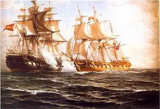 On 26–27 April 1818 she fought against the Spanish frigate Esmeralda and brigantine Pezuela outside Valparaiso. Although the attack on Esmeralda cost Captain O'Brien and his boarding party their lives, Lautaro did succeed in lifting the Spanish blockade of Valparaíso.[19] Later that year Lautaro, under the American, Captain Charles Wooster, was in the squadron under Commodore Blanco Encalada that surprised the relieving Spanish fleet at Talcahuano on 28 October. Lautaro and San Martín captured the Spanish frigate Reina María Isabel (later the Chilean frigate O'Higgins), the Perla, and the San Miguel.[22][23]