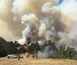 ![]() Smoke rises from the Chimney Fire on August 14. | |