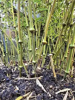 Chimonobambusa tumidissinoda (Chinese: 筇竹, commonly called walking stick bamboo) is a bamboo species, endemic to southwest Sichuan and northeast Yunnan, China, that has been used for walking sticks since the Han dynasty. Its culms are 2.5–6 meters in height and 1–3 cm in diameter, with large and greatly swollen disk-like nodes. Although it has been utilized since the Han dynasty (some 1200 years ago) it somehow escaped scientific description until 1980.[1]