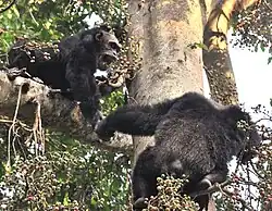 Chimpanzees do not appear to directly compete with gorillas in areas where they overlap. When fruit is abundant, gorilla and chimpanzee diets converge, but when fruit is scarce gorillas resort to vegetation.[70] The two apes may also feed on different species, whether fruit or insects.[64][65][71] Interactions between them can range from friendly and even stable social bonding,[72] to avoidance,[70][73] to aggression and even predation of infants on the part of chimpanzees.[74]