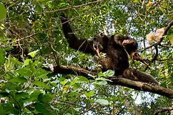 Leopards prey on chimpanzees in some areas.[78][79] It is possible that much of the mortality caused by leopards can be attributed to individuals that have specialised in killing chimpanzees.[78] Chimpanzees may react to a leopard's presence with loud vocalising, branch shaking, and throwing objects.[78][80] There is at least one record of chimpanzees killing a leopard cub after mobbing it and its mother in their den.[81] Four chimpanzees could have fallen prey to lions at Mahale Mountains National Park. Although no other instances of lion predation on chimpanzees have been recorded, lions likely do kill chimpanzees occasionally, and the larger group sizes of savanna chimpanzees may have developed as a response to threats from these big cats. Chimpanzees may react to lions by fleeing up trees, vocalising, or hiding in silence.[82]