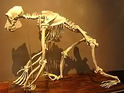 Chimpanzees are adapted for both arboreal and terrestrial locomotion. Arboreal locomotion consists of vertical climbing and brachiation.[45][46] On the ground, chimpanzees move both quadrupedally and bipedally. These movements appear to have similar energy costs.[47] As with bonobos and gorillas, chimpanzees move quadrupedally by knuckle-walking, which probably evolved independently in Pan and Gorilla.[48] Their muscles are 50% stronger per weight than those of humans due to higher content of fast twitch muscle fibres, one of the chimpanzee's adaptations for climbing and swinging.[49] According to Japan's Asahiyama Zoo, the grip strength of an adult chimpanzee is estimated to be 200 kg (440 lb),[50] while other sources claim figures of up to 330 kg (730 lb).[b]