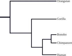 Taxnomic tree of apes, based on genome sequencing by The Chimpanzee Sequencing and Analysis Consortium. Figure from Yousaf et al. 2021,[4] adapted from Prado-Martinez et al. 2013.[5]
