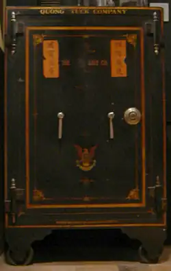 Quong Tuck Company safe. The Chinese writing on the safe says "May national treasure fill the coffer" (Chinese: 國寶盈庫; pinyin: guó bǎo yíng kù) and "May numerous sources of wealth come in." (Chinese: 財源廣進; pinyin: cáiyuán guǎng jìn)