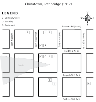 Lethbridge's Chinatown is a small district in downtown Lethbridge, Alberta, Canada. At the beginning of the 20th century, the district had a population of around 100 and businesses consisted of six laundries, four grocers and two restaurants. While the bulk of residences and businesses were focused along the 300 block of Ford Street — what is now modern Chinatown — this area was the centre of a much larger nine-block area.