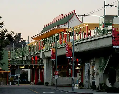 Chinatown station is an elevated light rail station on the A Line of the Los Angeles Metro Rail system. It is located along Spring Street above College Street in the Chinatown neighborhood of Los Angeles, just north of Downtown Los Angeles.[2] This station opened on July 26, 2003, as part of the original Gold Line, then known as the "Pasadena Metro Blue Line" project.