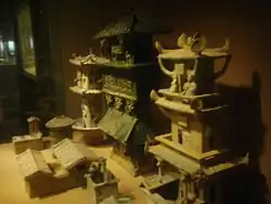 During the Jin dynasty (266–420) and the Six Dynasties, miniature models of buildings or entire architectural ensembles were often made to decorate the tops of the so-called "soul vases" (hunping), found in many tombs of that period.[54]