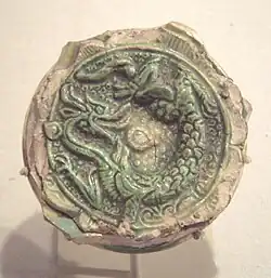 Such mixed influences are especially visible in the earthenwares of Northern China in the 6th century, such as those of the Northern Qi (550–577) or the Northern Zhou (557–581).[5][6] In that period, high quality high-fired earthenware starts to appear, called the "jeweled type", which incorporates lotuses from Buddhist art, as well as elements of Sasanian designs such as pearl roundels, lion masks or musicians and dancers.[5] The best of these ceramics use bluish green, yellow or olive glazes.[5]