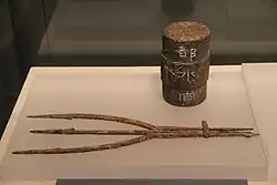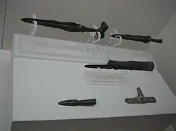 Early handheld weapons included the dagger-axe, a bronze blade mounted at right angles to a 0.9–1.8 m (2 ft 11 in – 5 ft 11 in) long shaft, and bronze spears roughly 2.1 m (6 ft 11 in) in length.[4] The dagger-axe was the first Chinese weapon designed to kill other people. Battles were fought in open formation to allow for the swinging of dagger-axes.[5]