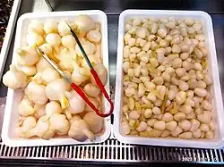 In Japanese, it is known as rakkyō (辣韮 or 薤). Glass bottles of white rakkyō bulb pickles are sold in Asian supermarkets in North America.[11]