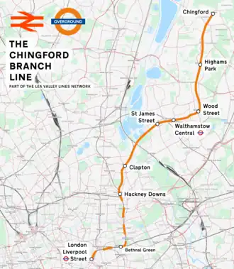 The Chingford branch line is a railway line between Clapton Junction (just northeast of Clapton station) and Chingford station. Services run between Liverpool Street station and Chingford, and are operated by London Overground.[note 1] The branch is part of the Lea Valley Lines.