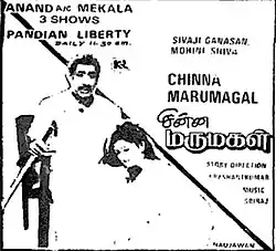 Chinna Marumagal (transl.Younger daughter-in-law) is a 1992 Indian Tamil-language drama film directed by Prasanthkumar (Pseudonym of Telugu Film Director P. Chandrasekhara Reddy) and produced by Keyaar. The film stars Sivaji Ganesan, Siva, Mohini and Delhi Ganesh in lead roles. It is a remake of 1988 Bengali film Chhoto Bou. The film was released on 23 May 1992.[1][2]