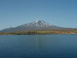 Chirip (Russian: Чирип, Japanese: 北散布山) is a volcano located in the central part of Iturup Island, Kuril Islands, Russia. In lies on the Chirip Peninsula and comprises two twin stratovolcanoes, Chirip and Bogdan Hmelnitskiy.[2] The western side is the steepest, sharing a basin with a small lake with Bogdan Hmelnitskiy. The basin has features that were created during an eruption. Many types of lava are found, including basalt, andesite, and small amounts of dacite.[3]
