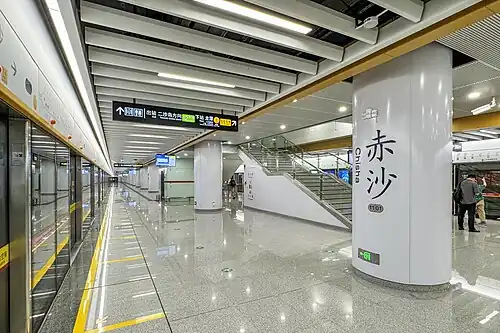 Chisha station (Chinese: 赤沙站; Cantonese Yale: Cěksāa Jaahm) is an interchange station between Line 11 and Line 12 of the Guangzhou Metro. The Line 11 platforms started operation on 28 December 2024.[1] It is located underground on Xinjiao East Road[2] in Haizhu District. The Line 11 tracks from this station are connected to Chisha Depot of Line 11,[3] and thus is the terminating station for Inner Circle Line 11 trains returning to the depot. It became an interchange station with Line 12 on 29 June 2025 when it started operations at this station.[4][5]