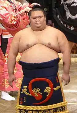 He first entered the professional sumo ring in July 2007. He slowly worked his way up the ranks, and after two years and two months in the ring his shikona (ring name) was changed to Chiyomaru following the Kokonoe stable custom of giving wrestlers a ring name that starts with Chiyo upon promotion to the sandanme division. Chiyomaru was judged by his appearance of his big, round belly when given the shikona of Chiyomaru which literally means ‘Eternally round’ in Japanese. It would take him over four years rising slowly through the lower divisions before reaching the professional ranks of jūryō.[1] During this time, in 2011 he and his brother's family home was lost in a fire and they agreed building their parents a new house could be motivation for them to achieve more success in sumo.[2] Chiyomaru's coach, the former Chiyonofuji remarked that before his brother overtook him he lacked motivation and disliked training, and in many ways it was being passed up by his own brother that spurred him on to improve his sumo. To add insult to injury, when Chiyomaru's younger brother became a sekitori (a salaried wrestler) and in need of an attendant, his coach chose Chiyomaru in hopes of motivating him to try harder to make the professional ranks and divest himself of this role. Chiyomaru admits that the indignity of being his own brother's attendant did motivate him and he might not have achieved promotion if this hadn't happened.[3]