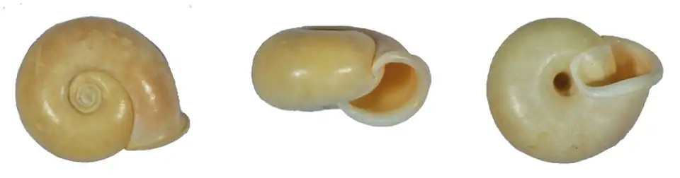 The shell is solid, unicolored light ochre, biconcave, irregularly striated according to some growth lines, with numerous hair pits covering the whole surface.[1] The spire is deeply sunken.[1] The shell has 33⁄4-41⁄2 whorls.[1] Whorls are rounded, first whorls very narrow, the last one very large, and partly embracing the preceding one, distinctly descending in front.[1] The umbilicus is deep, and about 1/8 of the width of the shell.[1] The aperture is crescent, a little oblique, peristome thick and expanded all around and is somewhat reflexed; both ends connected by a quite thin callus.[1] The width of the shell is 17.1-19.9 mm.[1] The height of the shell is 9.5-11.7 mm.[1]