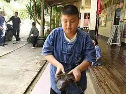 Local boy in mo hom shirt holding big-headed turtle