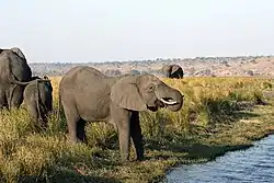 Kasane, Chobe National Park, Seboba Water Rapids, Pandamatenga Farms, Lesoma Memorial Monument, Kasane Hot Springs and Chobe River are the major tourist attractions in the district.[3] Most part of Botswana has tableland slopes sliding from east to west. The region has an average elevation of around 915 m (3,002 ft) above the mean sea level. The vegetation type is Savannah, with tall grasses, bushes and trees. The annual precipitation is around 65 cm (26 in), most of which is received during the summer season from November to May. Most of the rivers in the region are seasonal, with Chobe River, which are prone to flash floods, being the most prominent.[4] Chobe National Park is the second largest national park in the country and has the largest population of elephants in Africa. The district shares the international border of the country with Namibia and Zambia in the north, Zimbabwe in the east, and also the district borders along North-West district of the country.[5]