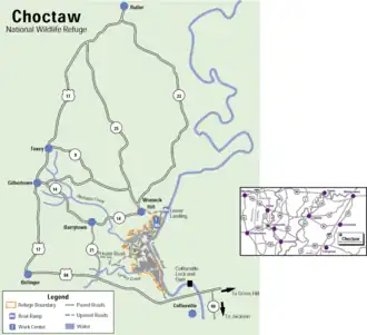 The Choctaw National Wildlife Refuge is a 4,218 acre (17.07 km2) National Wildlife Refuge located along the Tombigbee River near Coffeeville, Alabama. Named after the Choctaw tribe, it was established to provide a wood duck brood habitat and serve as a protected wintering area for waterfowl.