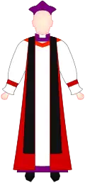 Anglican bishops usually wear a purple cassock. Over this they wear the rochet with red or black chimere and matching cuffs, black tippet, and sometimes an academic hood.