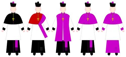 Priests who hold additional honors may wear a different cassock: Chaplains of His Holiness wear a black cassock with purple piping, buttons, and fascia; while Honorary Prelates and Protonotaries apostolic wear a purple cassock with scarlet piping and buttons, with a purple fascia. A black cassock with amaranth piping and buttons, girded with a purple fascia, serves as pian dress (academic dress) for an honorary prelate or protonotary apostolic. Canons may wear the rochet (if the chapter has been granted usus rochetti by papal indult) with a distinctive mozzetta, the particular colors of which are determined by the chapter.
