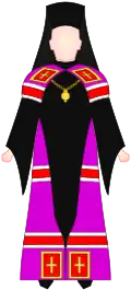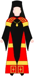 In Eastern Orthodoxy and Byzantine Catholicism, monks wear a black cloak, the mandyas over the outer cassock. The mandyas completely covers the monastic below the chin and reaches to the floor. In the Greek usage, the mandyas is usually worn only when performing certain liturgical roles; in the Slavic usage, all monks and nuns of the rank of Stavrophore or above wear the mandyas at every service, so long as they are in their own monastery. The mandyas of an hegumen (abbot) is of black silk, that of an archimandrite or bishop is of colored silk (specific usages will differ by jurisdiction), and has four square "tablets" on it: two at the neck and two at the feet. A bishop's mandyas additionally has "rivers" on it: three horizontal stripes either of gold (Greek practice) or red and white (Slavic practice).