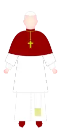 Bishops wear the above-mentioned purple cassock with scarlet piping, and add a pectoral cross suspended from a green and gold cord, a mozzetta over the rochet, and a purple zucchetto under the biretta. A cardinal wears a scarlet cassock with scarlet trim, pectoral cross on a red and gold cord, and a red mozzetta over the rochet, with a red zucchetto. The Pope's choir dress includes a white cassock, rochet, red silk mozetta, and red brocade stole; his pectoral cross hangs from a golden cord. Some canons wear their cross on a ribbon, but only a bishop may wear the cross on a cord. Under new regulations, neither bishops nor canons wear fur-trimmed cappas.