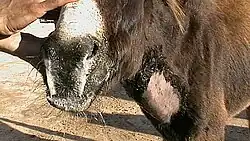 Choke is a condition in horses in which the esophagus is blocked, usually by food material. Although the horse is still able to breathe, it is unable to swallow, and may become severely dehydrated. A secondary condition, aspiration pneumonia, may also develop if food material and saliva accumulate in the pharynx, spilling into the trachea and into the lungs. Choke is one of the "top 10" emergencies received by equine veterinarians.[1]