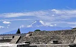 The most important tourist attraction of the city is the Great Pyramid with the Nuestra Señora de los Remedios sanctuary on top. At first glance, the pyramid looks like a hill as most of it is overgrown. The south side of the pyramid has been excavated and there is a network of tunnels inside.[4] The pyramid and church receives about 220,000 visitors each year, and on certain special occasions such as the spring equinox and the feast of the Virgin of the Remedies, there can be up to 20,000 visitors at a time.[26] From the top of the pyramid, in the sanctuary atrium, it is possible to see the Malinche, Popocatepetl, Iztaccíhuatl and Pico de Orizaba Volcanoes in the far eastern horizon.[27]