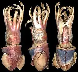The holotype (MNHN 3820), a female with missing tentacles, was collected in the N Ha’apai group of the Tonga Islands (19°42′S 174°26′W / 19.700°S 174.433°W / -19.700; -174.433) at a depth of 332 m. Paratype 1, a male known from only the head and brachial crown, came from the same station. Paratype 2 (MNHN 3822), also a female with missing tentacles, was collected from a seamount in the Tonga Islands (22°11′S 175°27′W / 22.183°S 175.450°W / -22.183; -175.450) at a depth of 385–405 m.[1]