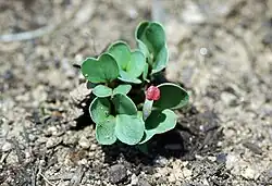 The taproots of the radish weigh 60–80 grams (2.1–2.8 oz), and are about ten to thirteen times smaller than a regular Korean radish. The upper part of the roots are subterranean stems, from which the long ovate leaves grow. The roots are 8–9 centimetres (3.1–3.5 in) long and the rhizomes are 2–3 centimetres (0.79–1.18 in) long.