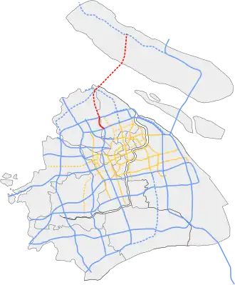 Whereas the island was previously only connected to the mainland by ferry service, the Shanghai Yangtze Bridge and Tunnel now connects Chenjia in southeastern Chongming with Shanghai via Changxing and the Chongqi Bridge connects Chenjia to Qidong in southeastern Jiangsu. The Chonghai Bridge under construction will link Xinhai at the west end of the island with Haimen District in Nantong, Jiangsu, while the proposed S7 (Huchong) Expressway would connect Chengqiao directly with Baoshan across the Yangtze.[1]