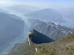 Chongqing covers a large area crisscrossed by rivers and mountains. The Daba Mountains stand in the north, the Wu Gorge in the east, the Wuling Mountains in the southeast, and the Dalou Mountains in the south. The area slopes downward from north to south towards the Yangtze valley, and features a large massif of mountains and hills, with steep sloping areas at different heights.[51] Karst landscape is common in this area, and stone forests, numerous collections of peaks, limestone caves and valleys can be found in many places. The Longshuixia Gap (Chinese: 龙水峡地缝), with its Three Natural Bridges, has made the region a popular tourist attraction. The Yangtze River runs through the whole area from west to east, covering a course of 665 km (413 mi), cutting through the Wu Mountains at three places and forming the well-known Three Gorges: the Qutang, Wuxia and Xiling gorges.[52] Coming from northwest and running through "the Jialing Lesser Three Gorges" of Libi, Wentang and Guanyin, the Jialing River joins the Yangtze in Chongqing.[53]