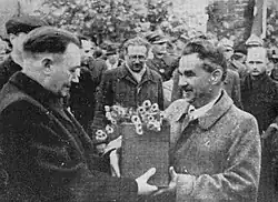 On 17 October 1945, the 96th anniversary of Chopin's death, the urn containing his heart was handed over to Leopold Petrzyk in Milanówek in St. Hedwig Church's courtyard. A delegation including pianist Bolesław Woytowicz then transported it by car to Żelazowa Wola, the village where Chopin was born, via a meandering 90-kilometre (56 mi) route taking it through Grodzisk Mazowiecki and Błonie. Crowds lined up along the route, which was adorned with white and red Polish flags.[5][7] Petrzyk passed the urn along to then-President Bolesław Bierut, who handed it over to Warsaw mayor Stanisław Tołwiński. Following a short concert by pianist Henryk Sztompka, the delegation proceeded to Warsaw. There, Wiktor Grodzicki gave a welcoming speech, saying in part: