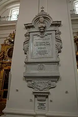 After the heart arrived in Warsaw, an afternoon commemorative service at Holy Cross Church was broadcast to the nation, with both the president and the prime minister of Poland in attendance.[9] A eulogy given by musicology professor Hieronim Feicht was described by the newspaper Życie Warszawy as "a profound analysis of the artistic values of Chopin's music". The heart was then returned to the pillar beneath a bust of Chopin created by sculptor Andrzej Pruszyński.[5]