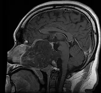 | MRI of extensive clival chordoma in 17-year-old male patient, axial view. Tumor in the nasopharynx extending from nasal cavity to brainstem posteriorly is clearly visible. | |