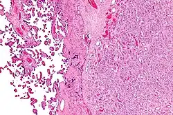 Chorioangioma, or chorangioma, is a benign tumor of placenta. It is a hamartoma-like growth in the placenta consisting of blood vessels,[1] and is seen in approximately 0.5 to 1% pregnancies.[2] It is mostly diagnosed ultrasonically in the second trimester of pregnancy. Large chorioangiomas are known to cause complications in pregnancy, while the smaller ones are asymptomatic.