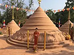 In temples, people erect a sand hillock on temple grounds. They mound up a big pointed hill of sand or dome in the center which represents Valuka Chaitya, the stupa at Tavatimsa where the Buddha's hair and diadem are buried. The big stupa is surrounded by four small ones, which represent the stupas of the Buddha's favorite disciples: Sariputta, Moggallana, Ananda, and Maha Kassapa. There is another tradition called Srang Preah (ស្រង់ព្រះ, Sráng Preăh) : pouring water or liquid plaster (a mixture of water with some chalk powder) on elder relative, or people (mostly the younger generation is responsible for pouring the water).